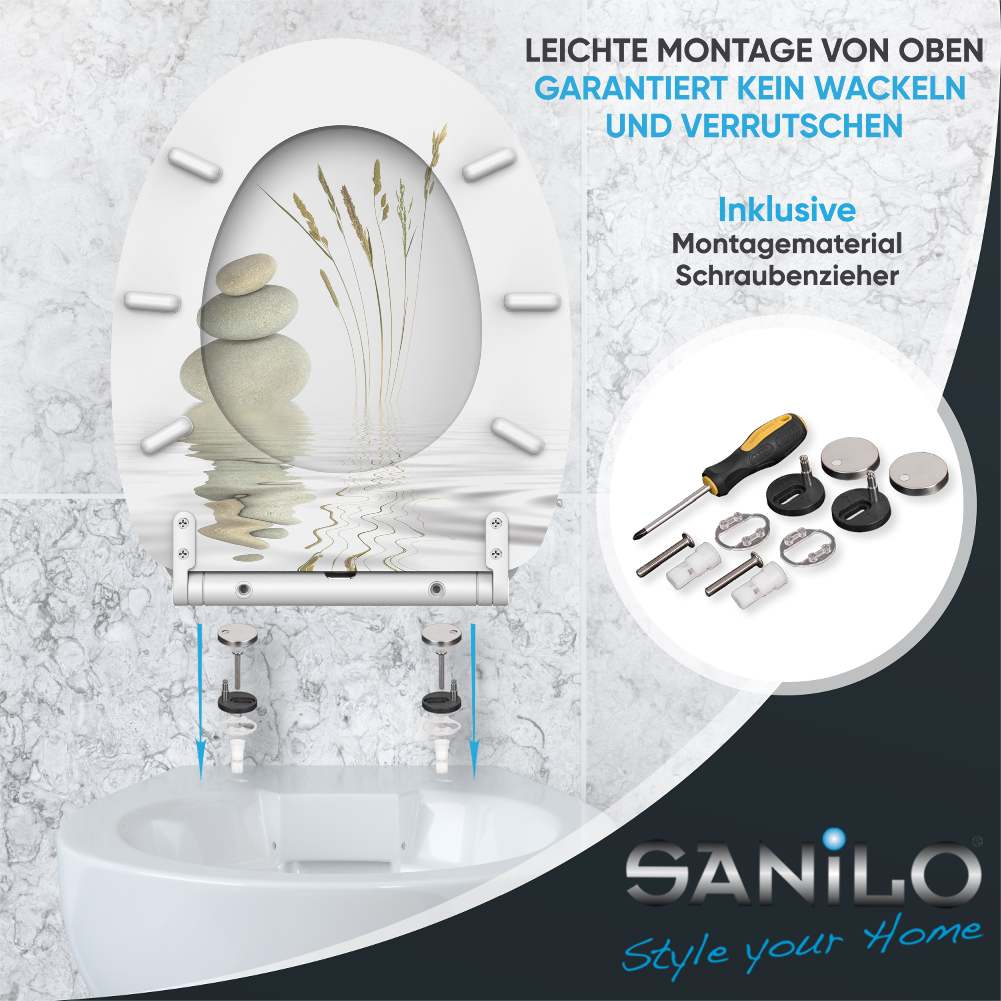 • Adjustable hinges to toilet bowl for all spacing 11,0 - 21,5 cm