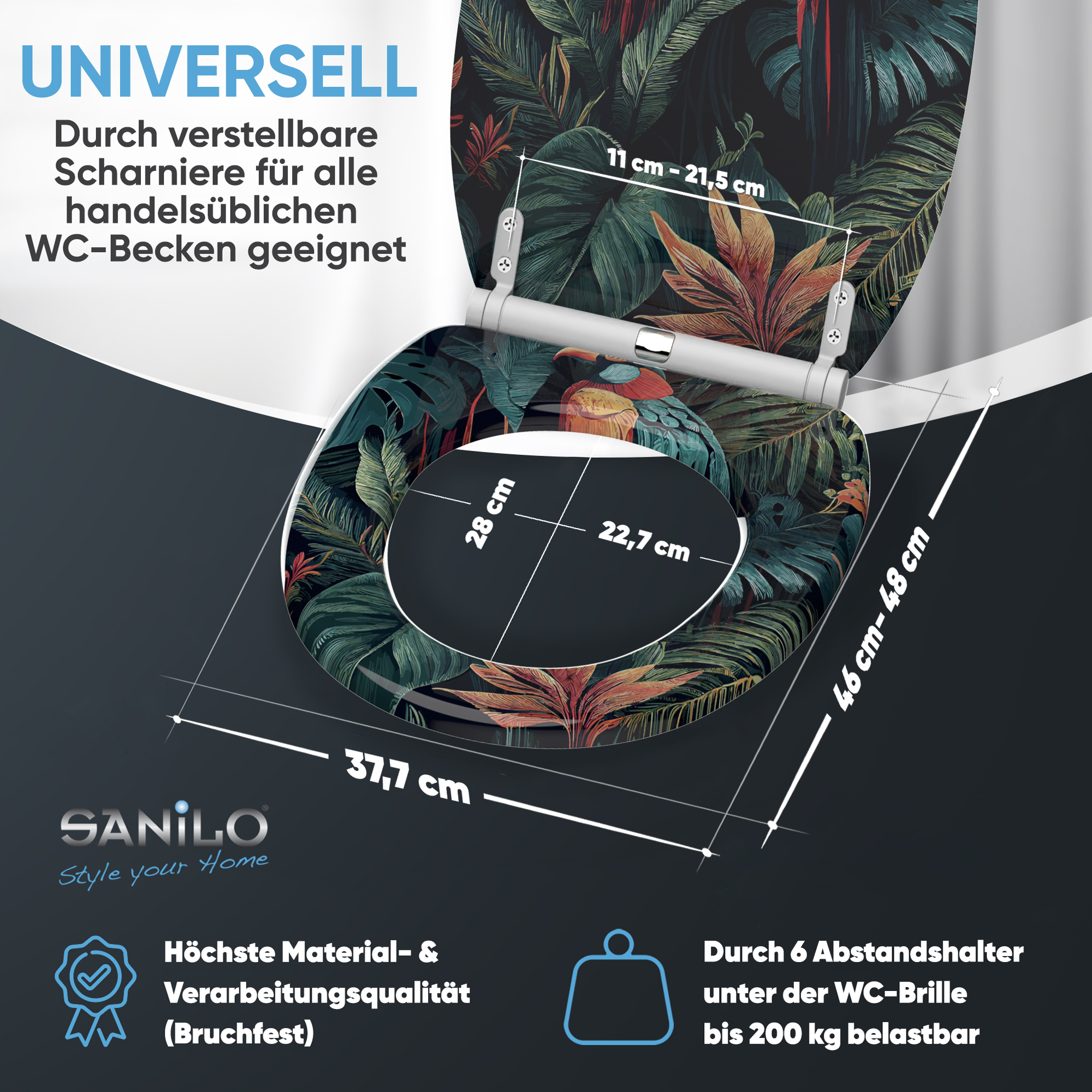 • Adjustable hinges to toilet bowl for all spacing 11,0 - 21,5 cm