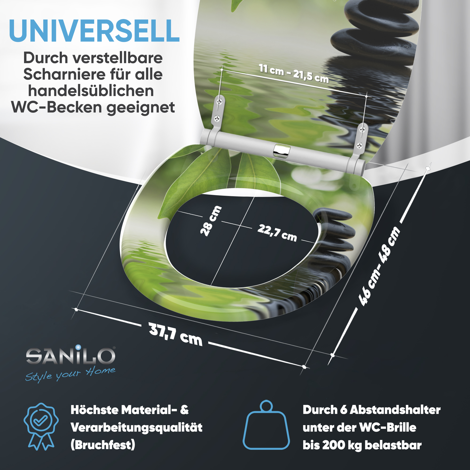• Adjustable hinges to toilet bowl for all spacing 11,0 - 21,5 cm