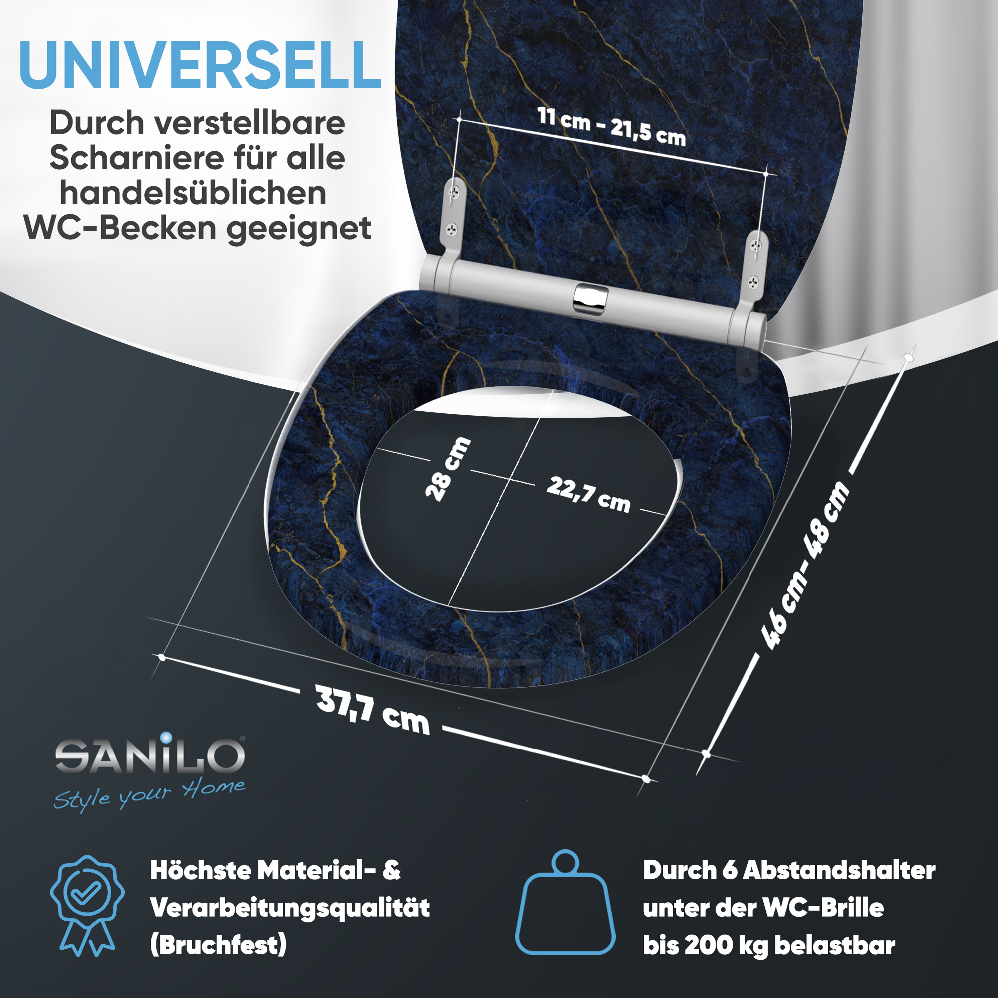 • Adjustable hinges to toilet bowl for all spacing 11,0 - 21,5 cm