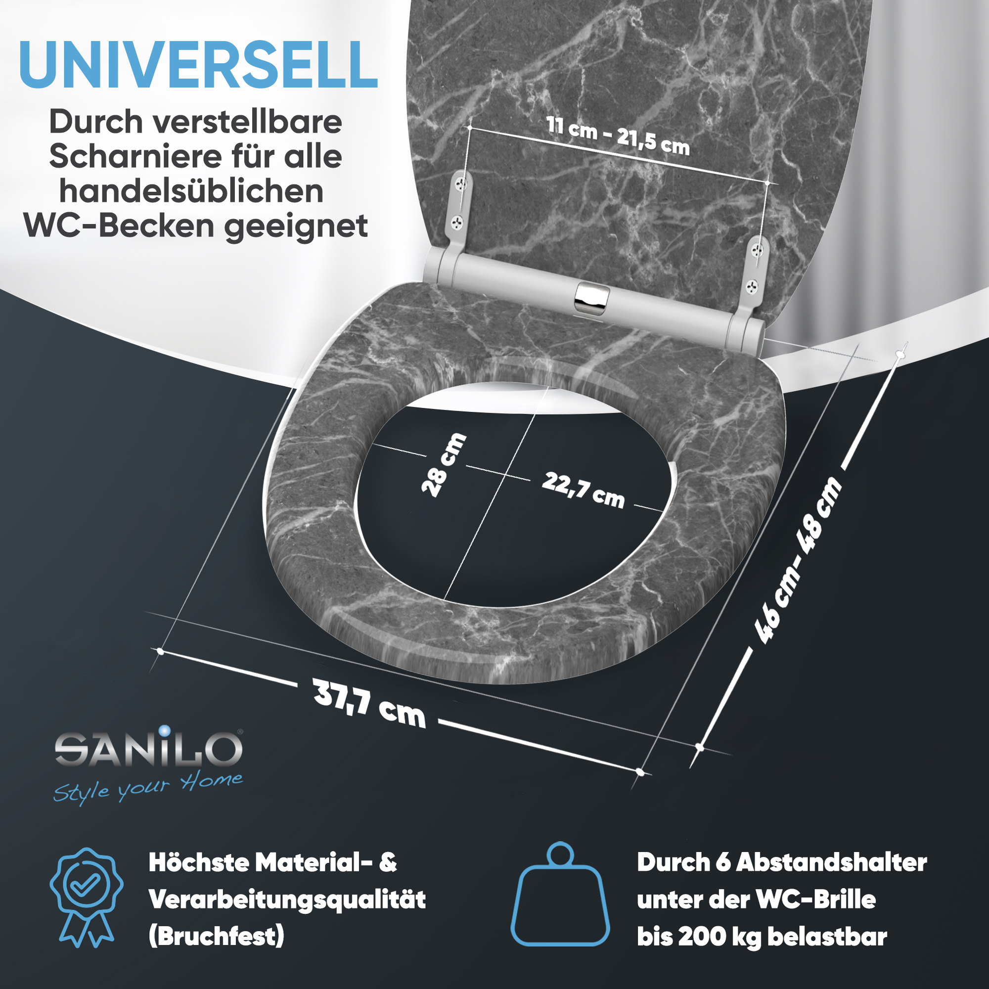 • Adjustable hinges to toilet bowl for all spacing 11,0 - 21,5 cm