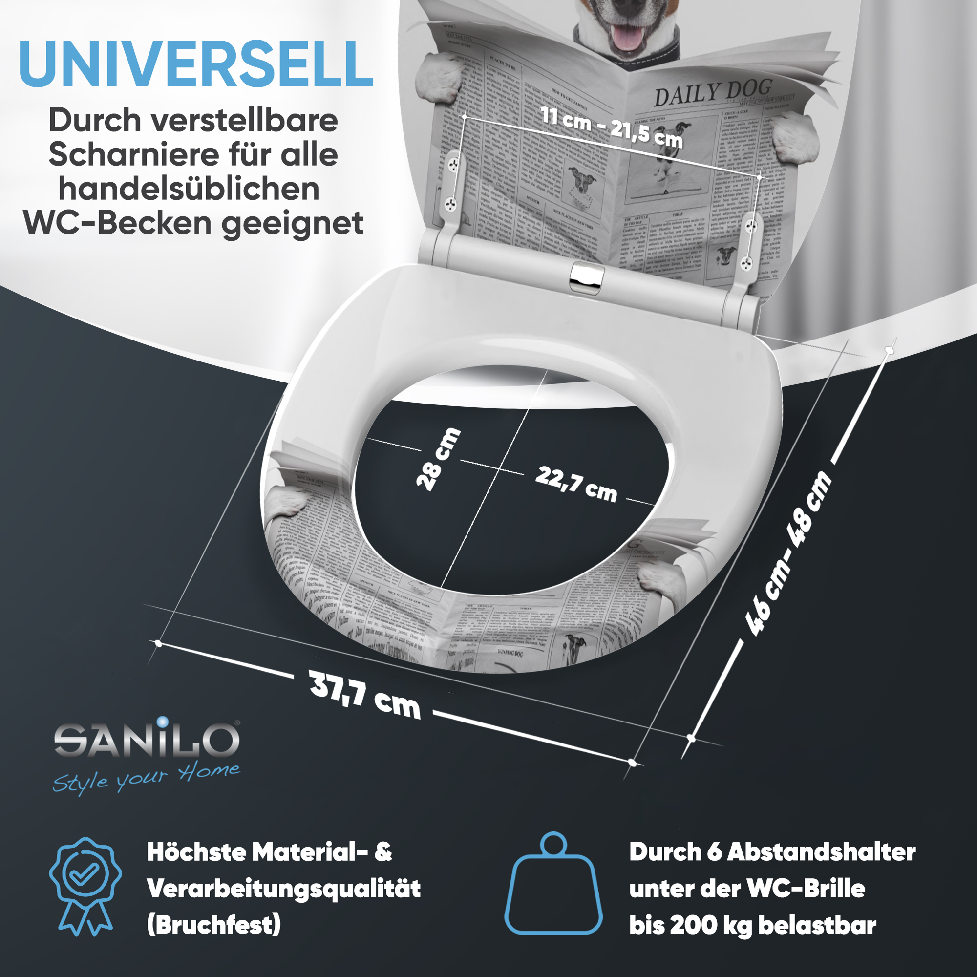 • Adjustable hinges to toilet bowl for all spacing 11,0 - 21,5 cm