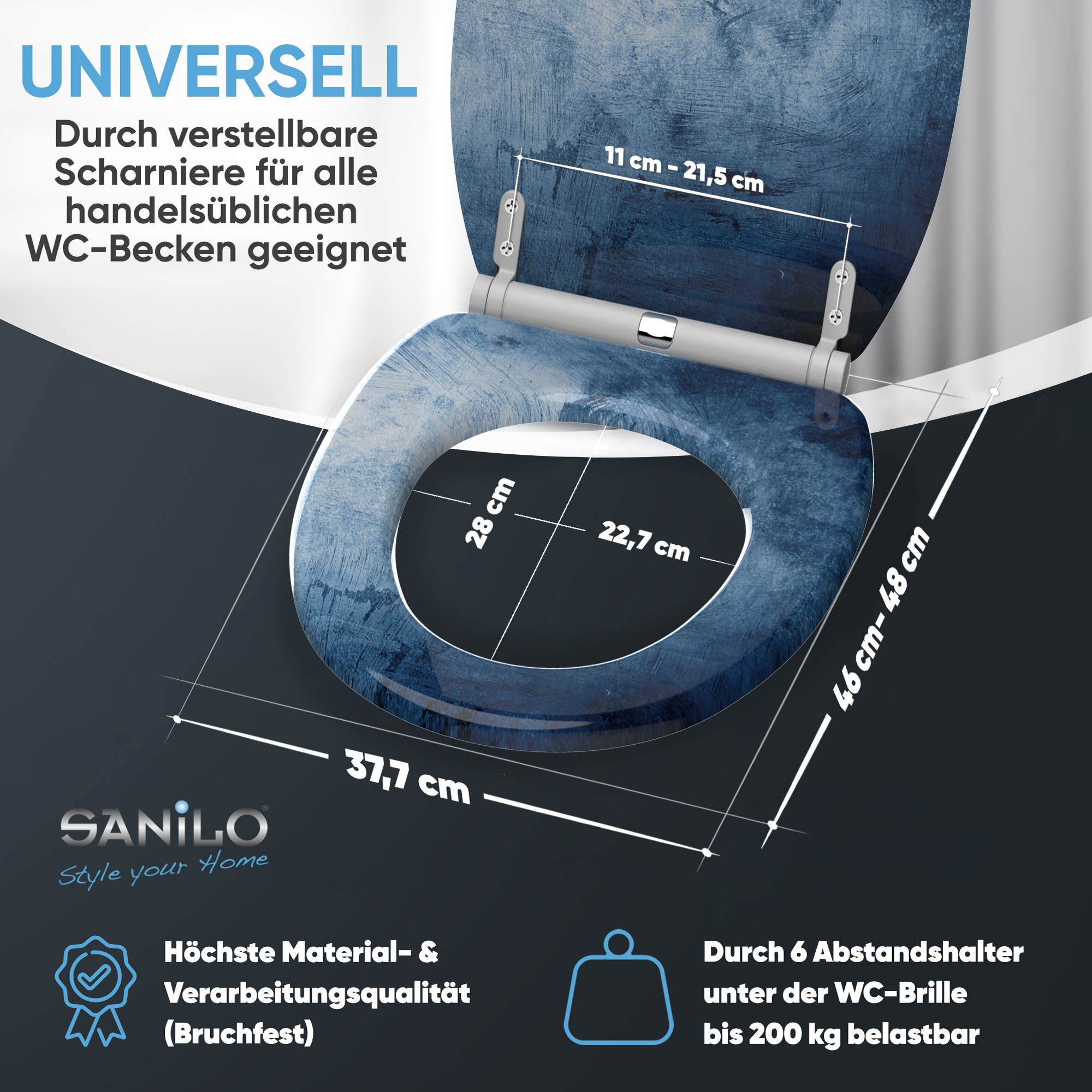 • Adjustable hinges to toilet bowl for all spacing 11,0 - 21,5 cm